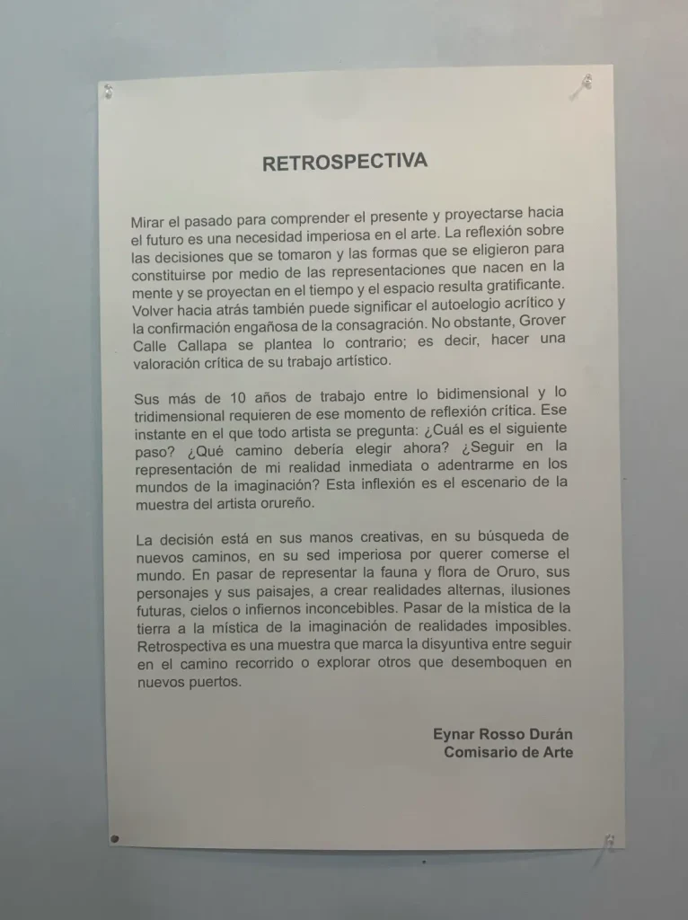 Mirar el pasado para comprender el presente y proyectarse hacia el futuro es una necesidad imperiosa en el arte. La reflexión sobre las decisiones que se tomaron y las formas que se eligieron para constituirse por medio de las representaciones que nacen en la mente y se proyectan en el tiempo y el espacio resulta gratificante. Volver hacia atrás también puede significar el autoelogio acrítico y la confirmación engañosa de la consagración. No obstante, Grover Calle Callapa se plantea lo contrario; es decir, hacer una valoración crítica de su trabajo artístico.